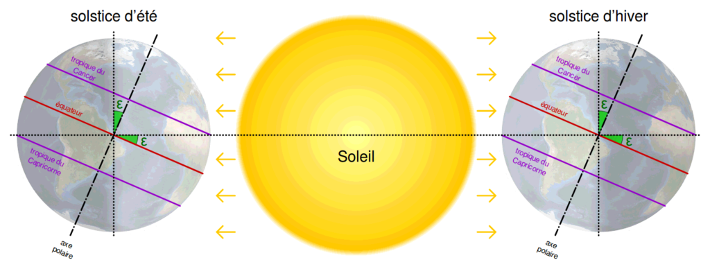 L’axe de rotation de la Terre est incliné (de 23°7′) par rapport au plan de l’écliptique : c’est l’obliquité, qui nous vaut les saisons.