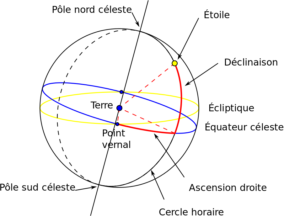 L’intersection de l’écliptique avec l’équateur céleste définit deux points. Celui pointant dans la constellation des Poissons s’appelle le point vernal. À partir de ce point, on établit l’ascension droite sur l’équateur céleste (ligne rouge horizontale).