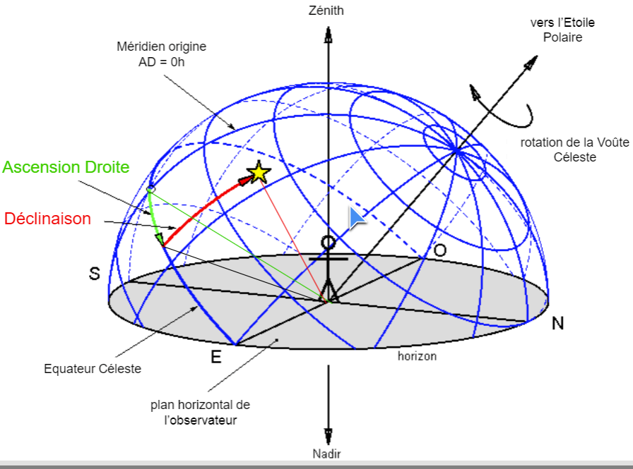 La déclinaison est déterminée à partir de la position de l’objet sur le méridien (ligne rouge verticale).